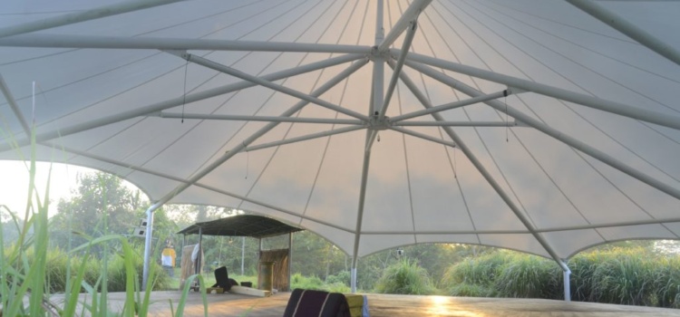 Ở những không gian ngoài trời rộng, nơi ánh nắng chiếu gần như thẳng đứng vào giữa trưa, mái vòm hoặc mái dạng cánh buồm nhiều điểm neo thường được áp dụng.